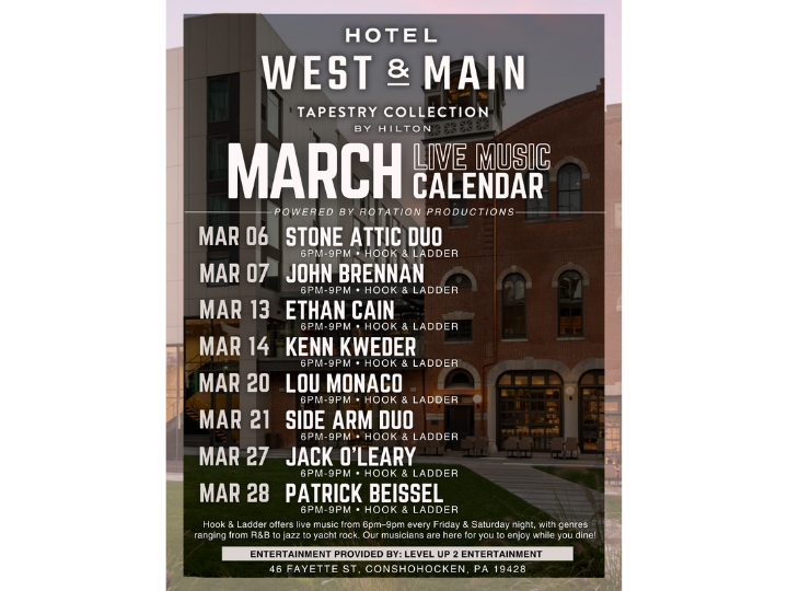 Located on the second floor of the new West & Main hotel, Hook and Ladder Sky Bar brings an elevated dining experience previously unseen in Conshohocken. The atmosphere in this memorable and moody chophouse wows guests with impeccably restored original firehouse features. The Sky Bar is a lively space to enjoy cocktails, bites and take in the views overlooking the common area, with greenery and photo-op worthy moments throughout.